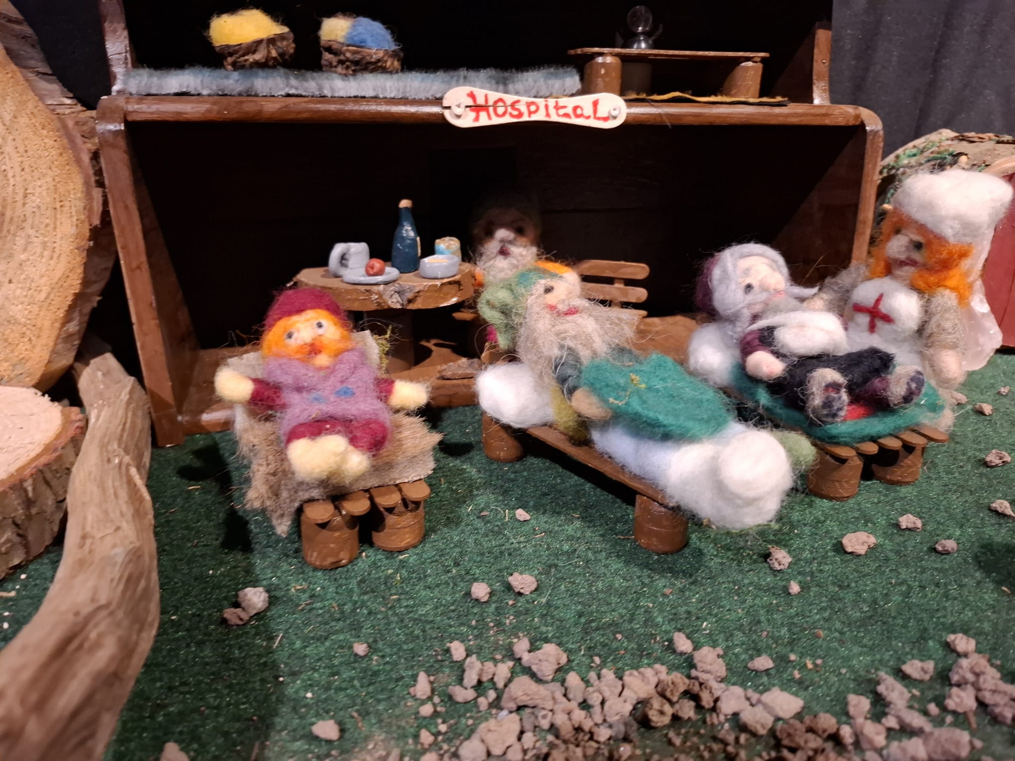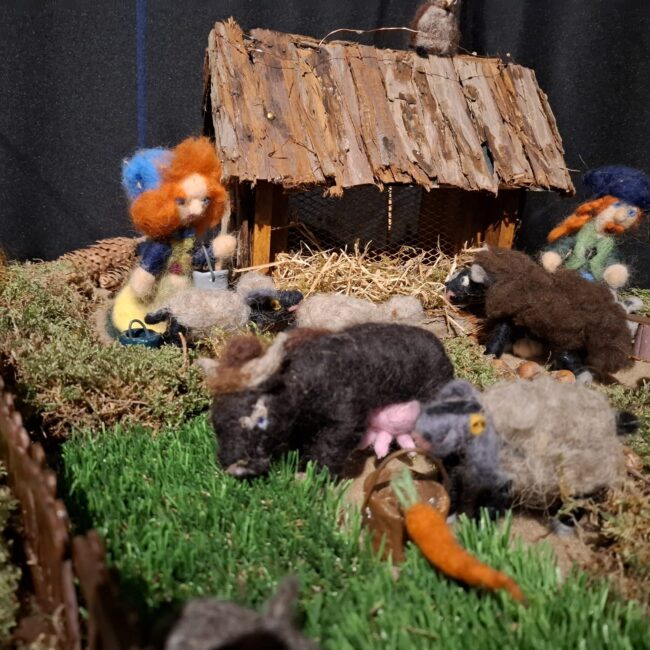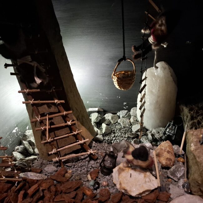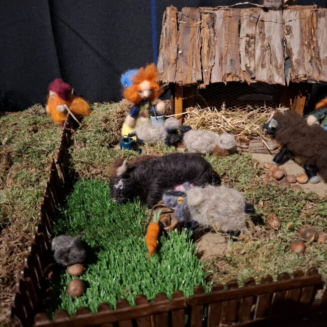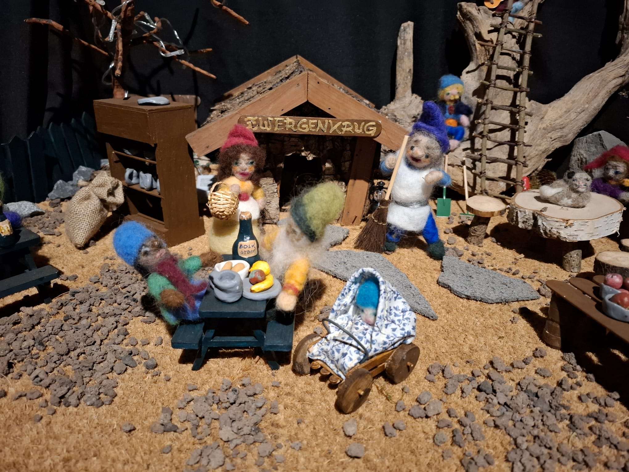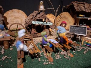 So kam Filomena ins Gespräch mit Ruth und Rainer Nabbefeld, so hießen die beiden Menschen. Diese überlegten nicht lange und boten ihre Hilfe an. Von da an begannen die beiden ein Dorf für die Zwerge zu bauen, in dem diese den Winter verbringen konnten. Das war jede Menge Arbeit, aber die beiden hatten Spaß dabei. Der Ort an dem das Dorf aufgestellt werden konnte war auch schnell gefunden. Die Heimatstuben des Hülser Heimatvereins konnten dafür gut genutzt werden.