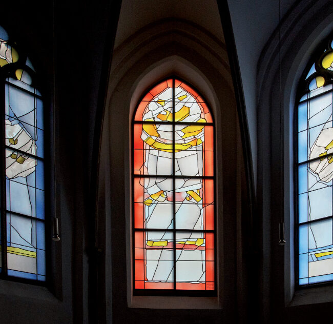 - Adamsbild. Das Glasbild aus der Mitte des 16. Jahrhunderts stammt vermutlich ursprünglich aus einem Kloster in der Eifel und weist auf eine Adelsfamilie Hambach hin. Es war für die moderne Bruder-Konrad-Kapelle auf dem Hülser Berg gestiftet worden und dort bis zur Aufgabe der Kapelle in die Altarwand eingebaut.
